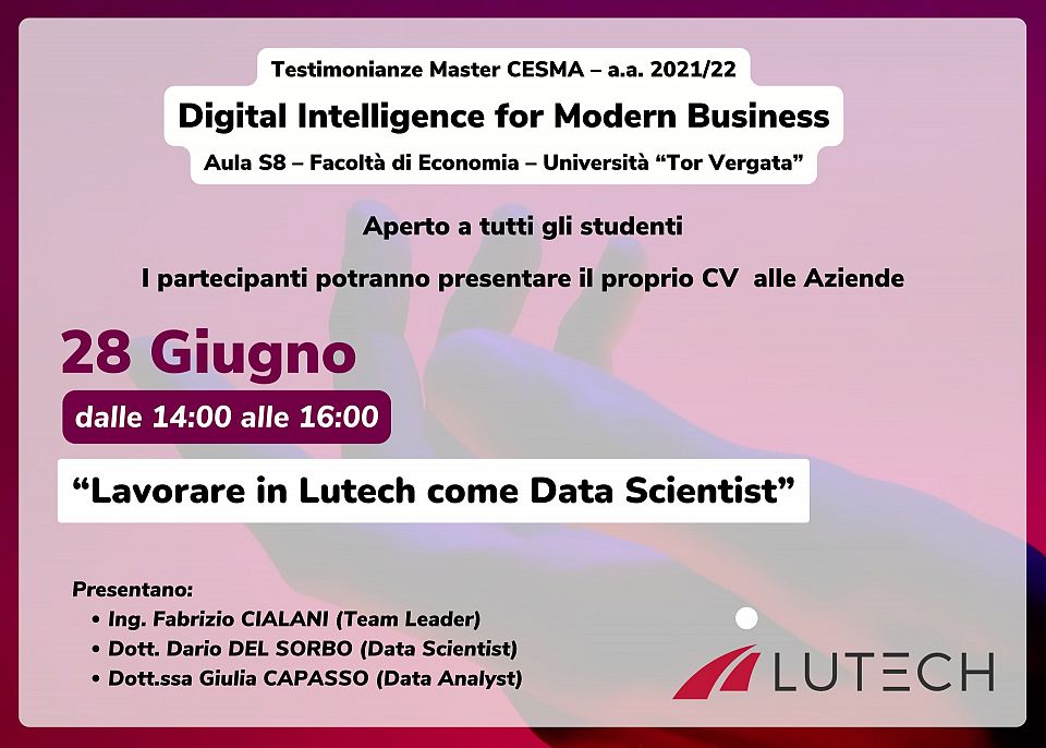 TESTIMONIANZA AZIENDALE LUTECH - 28 GIUGNO 2022 - 14:00/16:00 - AULA S8 - ECONOMIA